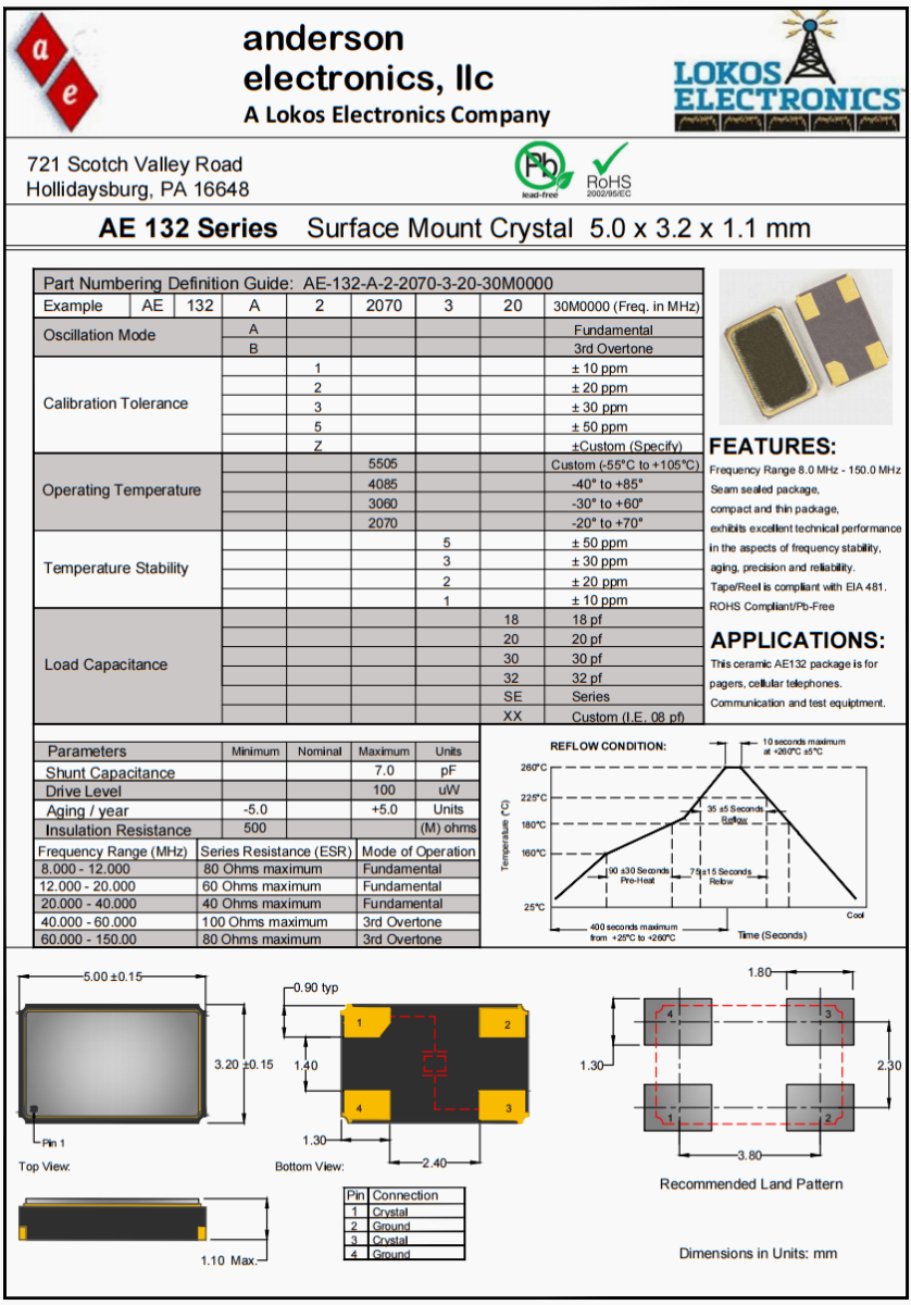 安德森進口無源晶振,AE132汽車大燈晶振,AE-132-A-2-2070-3-20-30M0000高品質晶振,美國安德森晶振公司,Anderson晶振,AE-132晶振,無源晶振,貼片晶振,7050晶振,高精度晶振,高品質晶振,美國晶振,進口晶振,低損耗晶振,高質量晶振,通訊設備晶振,路由器晶振,石英晶振,產品具有高精度超小型的表面貼片型石英晶體振蕩器,最適用于移動通信終端的基準時鐘等移動通信領域.比如智能手機,無線通信,衛星導航,平臺基站等較高端的數碼產品,晶振本身小型,薄型具備各類移動通信的基準時鐘源用頻率,貼片晶振具有優良的電氣特性,耐環境性能適用于移動通信領域,滿足無鉛焊接的高溫回流溫度曲線要求,符合RoHS/無鉛。