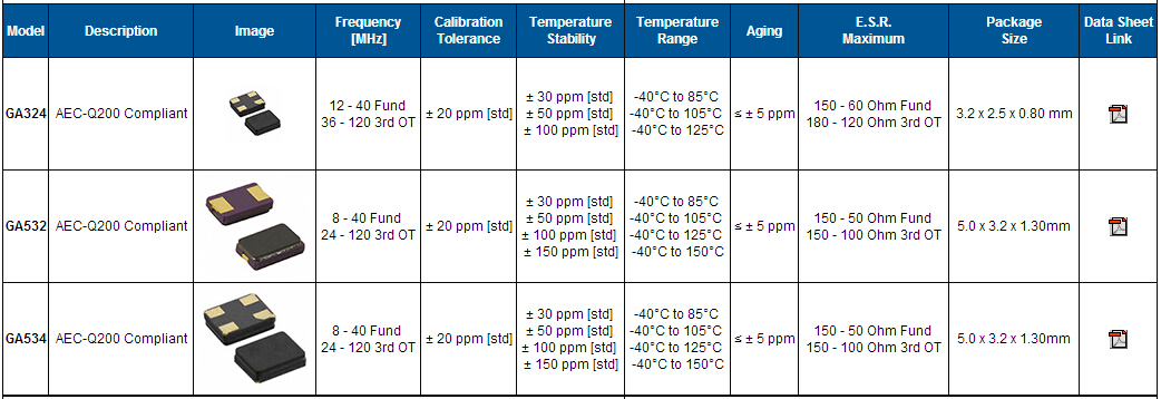 | 頻率公差25℃ | ±20 ppm, ±30 ppm, ±50 ppm | |