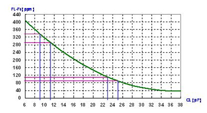 頻率的“牽引率”指的是負載電容CL1的頻率FL1到負載電容CL2的頻率FL2的頻率變化. 在圖中可以是FL1(CL=24pF)與FL2(CL=10pF)的頻率變化值. 在這個例子中的頻率牽引率是 220 ppm. 若我們將CL1與CL2的負載電容值趨近極小化(曲線作數(shù)學上的微分), 就會得到曲線的切線值. 這個切線值就是用某一個負載電容的敏感度( trim sensitivity ).