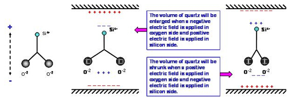 石英材料中的二氧化硅分子(SiO2) 在正常狀態(tài)下, 其電偶極是互相平衡的電中性. 在圖的二氧化硅是以二維空間的簡化圖形. 當我們在硅原子上方及氧原子下方分別給予正電場及負電場時, 空間系統(tǒng)為了維持電位平衡, 兩個氧原子會相互排斥, 在氧原子下方形成一個感應正電場區(qū)域, 同時在硅原子上方產(chǎn)生感應負電場區(qū)域. 相反的情況, 當我們在硅原子上方及氧原子下方分別給予負電場及正電場時, 兩個氧原子會相互靠近, 氧原子下方產(chǎn)生感應負電場,硅原子上方產(chǎn)生感應正電場. 然而, 氧原子的水平位置變化時, 鄰近的另一個氧原子會相對的產(chǎn)生排斥或吸引的力量, 迫使氧原子回到原來的空間位置. 因此, 電場的力量與原子之間的力量會相互牽動, 電場的改變與水平方向的形變是形成交互作用狀態(tài). 這個交互作用會形成一個在石英材料耗能最小的振動狀態(tài), 祇要由電場持續(xù)給與能量, 石英材料就會與電場之間維持一個共振的頻率. 這個壓電效應下氧原子的振幅與電場強度及電場對二氧化硅的向量角度有相對應的關系.在實際的應用上, 電場是由鍍在石英芯片上的金屬電極產(chǎn)生, 電場與二氧化硅的向量角度則是由石英晶棒的切割角度來決定.
