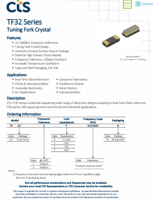 CTS無源晶振TF32,TF322N32K7680R石英貼片晶體,西迪斯晶振,SMD晶振,石英晶體諧振器,無源晶振,無源石英晶體,貼片諧振器,3215mm晶振,型號TF32,編碼TF322N32K7680R是一款兩腳貼片型的音叉晶體,尺寸為3215mm,頻率為32.768KHZ,負載電容7pF,精度20ppm,工作溫度-40°C~+85°C,具備高質量低損耗的特點,TFE202P32K7680R和TF322N32K7680R廣泛用于實時時鐘參考,可穿戴電子,物聯網應用,消費電子,醫療保健設備智能電表,儀表等領域.CTS無源晶振TF32,TF322N32K7680R石英貼片晶體