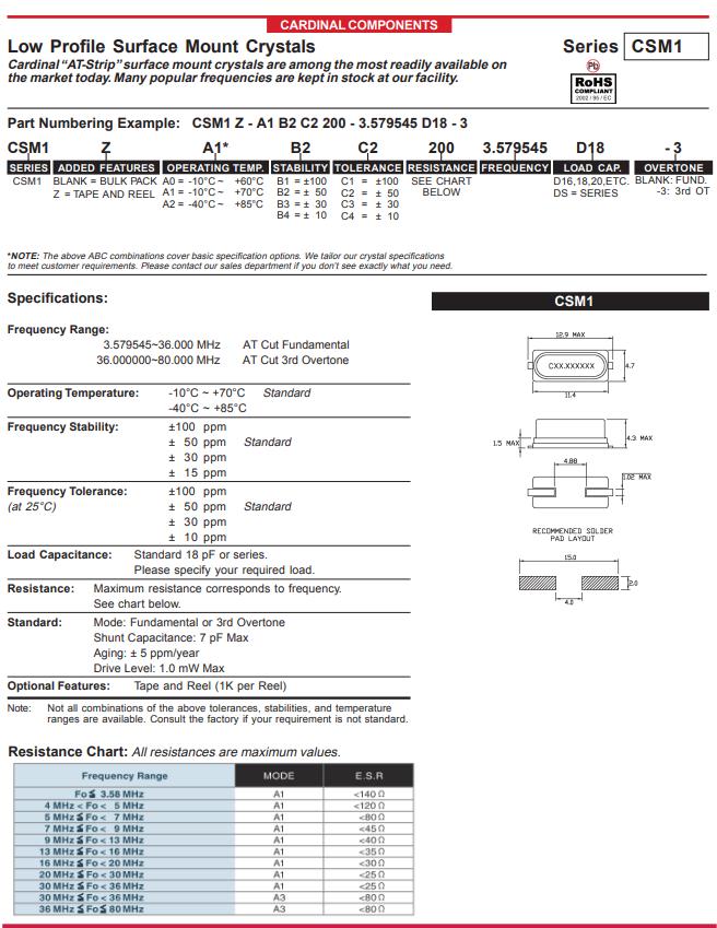 | CSM1Z-A0B2C3-80-13.5D18 | Cardinal晶振 | CSM1 | 13.5MHz | ±50ppm | 80 Ohm | -10°C ~ 60°C |