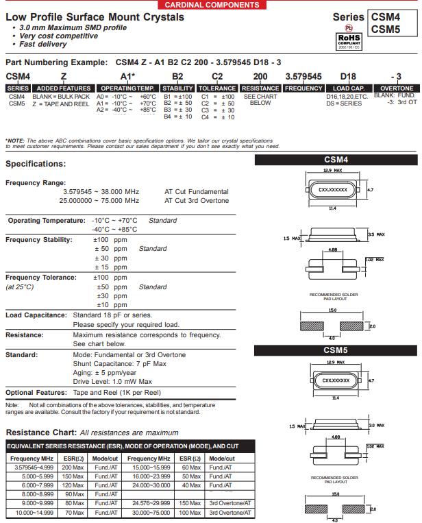 卡迪納爾晶振,CSM4Z-A2B3C3-40-12.0D18,6G低成本晶振參數表
