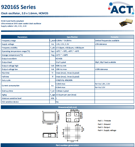 ACT晶振,92016S晶振,時(shí)鐘晶體振蕩器.貼片石英晶振,體積小,焊接可采用自動(dòng)貼片系統(tǒng),產(chǎn)品本身小型,表面貼片晶振,特別適用于有小型化要求的電子數(shù)碼產(chǎn)品市場(chǎng)領(lǐng)域,因產(chǎn)品小型,薄型優(yōu)勢(shì),耐環(huán)境特性,包括耐高溫,耐沖擊性等,在移動(dòng)通信領(lǐng)域得到了廣泛的應(yīng)用,晶振產(chǎn)品本身可發(fā)揮優(yōu)良的電氣特性,滿足無(wú)鉛焊接的高溫回流溫度曲線要求.