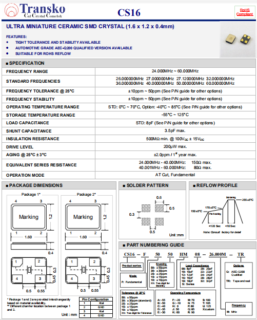 Transko晶振,CS16晶振,無鉛環(huán)保晶體.貼片壓電石英晶體,體積小,焊接可采用自動(dòng)貼片系統(tǒng),產(chǎn)品本身小型,表面貼片晶振,特別適用于有小型化要求的電子數(shù)碼產(chǎn)品市場(chǎng)領(lǐng)域,因產(chǎn)品小型,薄型優(yōu)勢(shì),耐環(huán)境特性,包括耐高溫,耐沖擊性等,在移動(dòng)通信領(lǐng)域得到了廣泛的應(yīng)用,晶振產(chǎn)品本身可發(fā)揮優(yōu)良的電氣特性,滿足無鉛焊接的高溫回流溫度曲線要求.