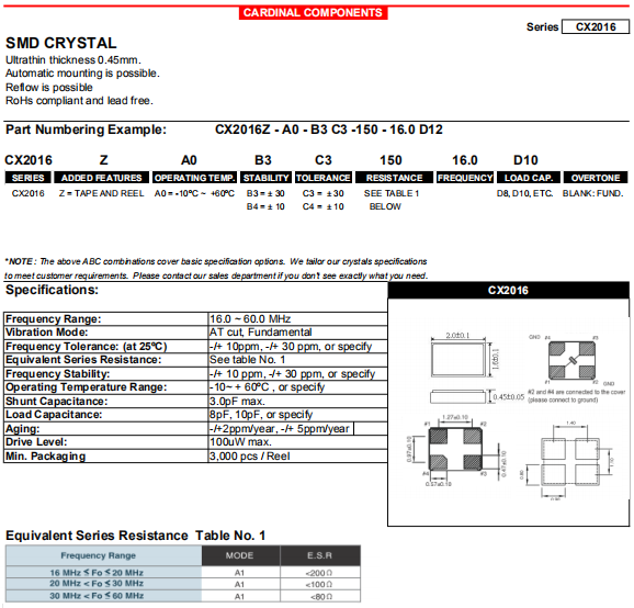 Cardinal晶振,CX2016晶振,進口環保晶振.小型貼片石英晶振,外觀尺寸具有薄型表面貼片型石英晶體諧振器,特別適用于有小型化要求的市場領域,比如智能手機,無線藍牙,平板電腦等電子數碼產品.晶振本身超小型,薄型,重量輕,晶體具有優良的耐環境特性,如耐熱性,耐沖擊性,在辦公自動化,家電相關電器領域及Bluetooth,Wireless LAN等短距離無線通信領域可發揮優良的電氣特性,滿足無鉛焊接的回流溫度曲線要求.