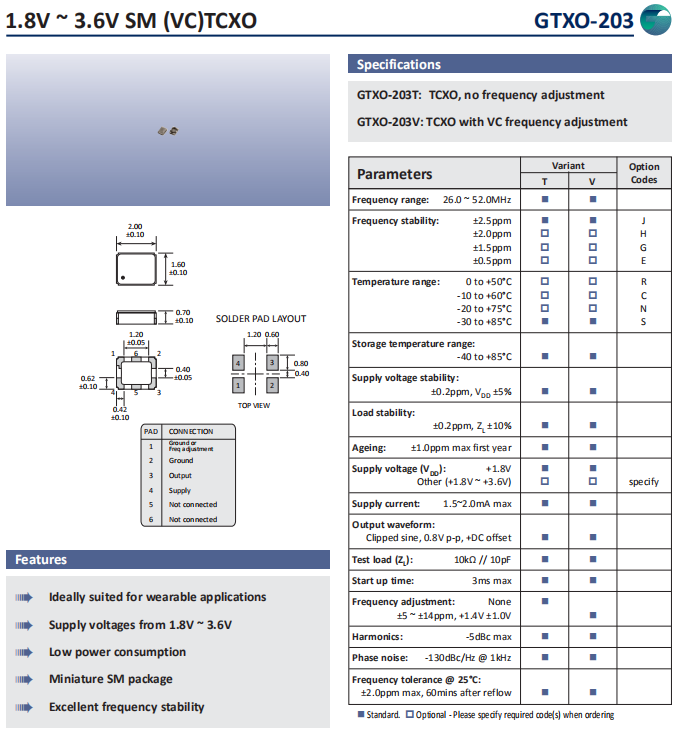 Golledge晶振,GTXO-203晶振,TCXO振蕩器.為對應低電源電壓的產品.(DC+1.8V±0.1V to +2.9V±0.1V對應IC可能) 高度:高0.8 mm,體積:0.0022 cm3,重量:0.008 g,小型,輕型,低消耗電流,表面貼片型產品.(可對應回流焊)無鉛產品.滿足無鉛焊盤的高溫回流溫度曲線要求,帶有AFC(頻率控制)功能,Enable/Disable功能,產品本身可根據使用需要進行選擇.