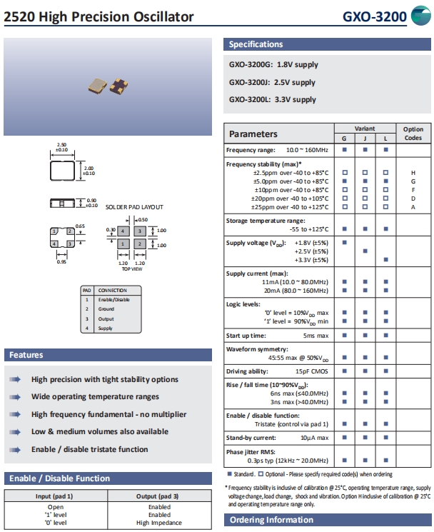 Golledge晶振,GXO-3200晶振,進口水晶振蕩子.小型貼片有源晶振,體積的變小也使產品帶來了更高的穩定性能,接縫密封石英晶體振蕩器,精度高,覆蓋頻率范圍寬的特點,貼片高速自動安裝和高溫回流焊設計,Optionable待機輸出三態輸出功能,電源電壓范圍:1.8V?5V,高穩定性,低抖動,低功耗,主要應用領域:無線通訊,智能手機,平板筆記本WLAN,藍牙,數碼相機,DSL和各式IT產品的晶振應用,三態功能,PC和LCDM等數碼領域,符合RoHS/無鉛.
