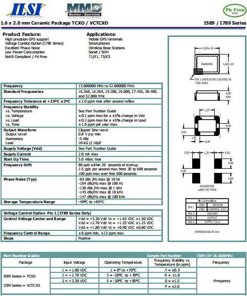 ILSI晶振,I789晶振,壓控溫補晶體振蕩器.智能手機晶振,產(chǎn)品具有高精度超小型的表面貼片型石英晶體振蕩器,最適用于移動通信終端的基準時鐘等移動通信領(lǐng)域.比如智能手機,無線通信,衛(wèi)星導航,平臺基站等較高端的數(shù)碼產(chǎn)品,晶振本身小型,薄型具備各類移動通信的基準時鐘源用頻率,貼片晶振具有優(yōu)良的電氣特性,耐環(huán)境性能適用于移動通信領(lǐng)域,滿足無鉛焊接的高溫回流溫度曲線要求.
