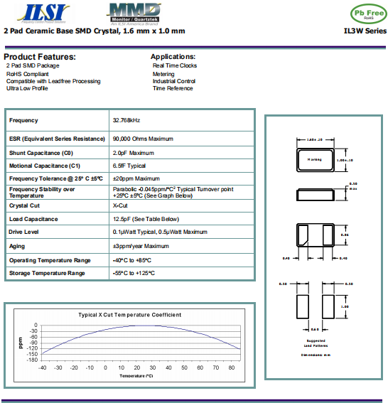 ILSI晶振,IL3W晶振,石英晶體諧振器.32.768K系列具有超小型,薄型,質(zhì)地輕的表面貼片音叉型石英晶體諧振器,晶振產(chǎn)品本身具備優(yōu)良的耐熱性,耐環(huán)境特性,在辦公自動化,家電領(lǐng)域,移動通信領(lǐng)域可發(fā)揮優(yōu)良的電氣特性,符合無鉛標準,滿足無鉛焊接的回流溫度曲線要求,金屬外殼的石英晶振使得產(chǎn)品在封裝時能發(fā)揮比陶瓷晶振外殼更好的耐沖擊性能.