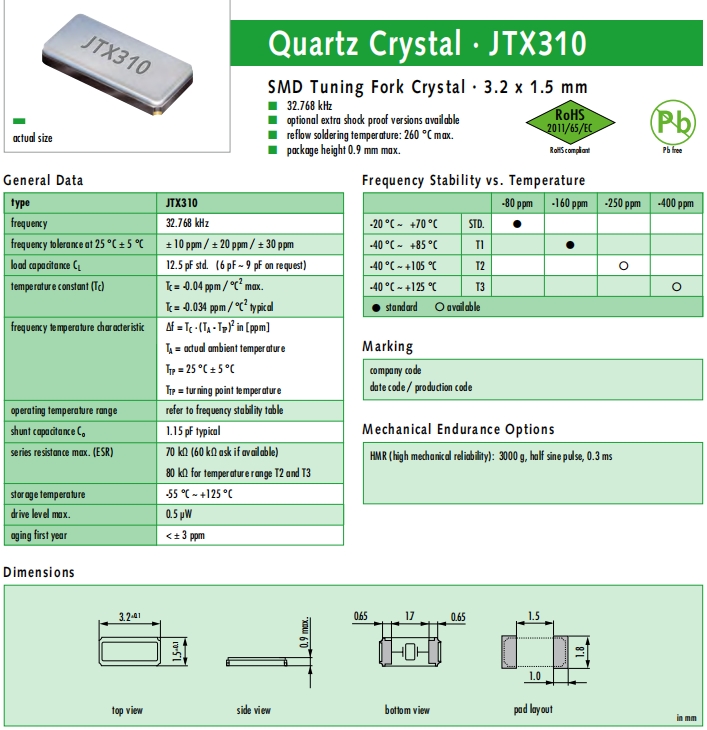 JAUCH晶振,JTX310晶振,壓電石英晶體.貼片表晶32.768K系列具有超小型,薄型,質(zhì)地輕的表面貼片音叉型石英晶體諧振器,晶振產(chǎn)品本身具備優(yōu)良的耐熱性,耐環(huán)境特性,在辦公自動化,家電領(lǐng)域,移動通信領(lǐng)域可發(fā)揮優(yōu)良的電氣特性,符合無鉛標準,滿足無鉛焊接的回流溫度曲線要求,金屬外殼的石英晶振使得產(chǎn)品在封裝時能發(fā)揮比陶瓷晶振外殼更好的耐沖擊性能.