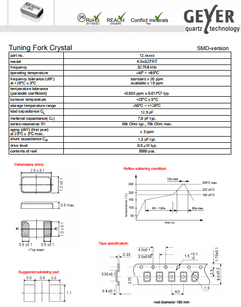 Geyer晶振,KX-327RT晶振,無源環(huán)保晶振.小體積SMD時鐘石英晶體諧振器,是貼片音叉晶體,千赫頻率元件,應(yīng)用于時鐘模塊,智能手機(jī),全球定位系統(tǒng),因產(chǎn)品本身體積小,SMD編帶型,可應(yīng)用于高性能自動貼片焊接,被廣泛應(yīng)用到各種小巧的便攜式消費(fèi)電子數(shù)碼時間產(chǎn)品,環(huán)保性能符合ROHS/無鉛標(biāo)準(zhǔn).