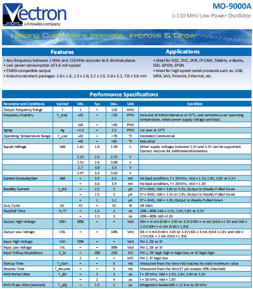 VECTRON晶振,MO-9000A晶振,低電壓振蕩器.小體積貼片2520mm晶振,外觀小型,表面貼片型晶體諧振器,因本身體積小等優勢,適用于移動通信終端的基準時鐘等移動通信領域.小型,薄型,輕型 (2.5 × 2.0 × 0.75mm typ.) 具備優良的耐環境特性及高耐熱性強.滿足無鉛焊接的回流溫度曲線要求.