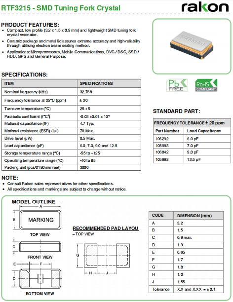 Rakon晶振,RTF3215晶振,壓電石英晶體.32.768K時鐘晶體具有小型,薄型,輕型的貼片晶振表面音叉型晶體諧振器,產品具有優良的耐熱性,耐環境特性,可發揮晶振優良的電氣特性,符合RoHS規定,滿足無鉛焊接的高溫回流溫度曲線要求,金屬外殼的封裝使得產品在封裝時能發揮比陶瓷諧振器外殼更好的耐沖擊性.