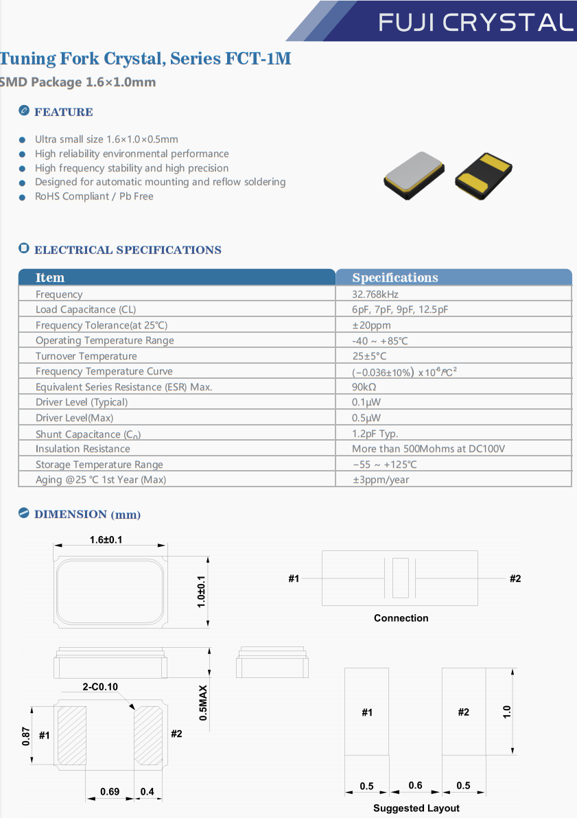| FCT1M032768C5Y1 | Fuji晶振 | FCT-1M | 32.768 kHz | 12.5pF | -40°C ~ 85°C |