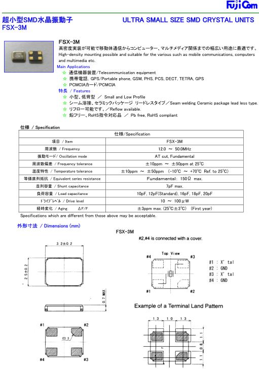 Fujicom晶振,FSX-3M四腳貼片晶振,SMD水晶振動子,超小型表面貼片型石英SMD晶振,最適合使用在汽車電子領域中,也是特別要求高可靠性的引擎控制用CPU的時鐘部分.低頻晶振可從7.98MHz起對應,小型,超薄型具備強防焊裂性,石英晶體在極端嚴酷的環(huán)境條件下也能發(fā)揮穩(wěn)定的起振特性,產(chǎn)品本身具有耐熱,耐振,耐撞擊等優(yōu)良的耐環(huán)境特性,滿足無鉛焊接以及高溫回流溫度曲線要求,符合AEC-Q200標準.