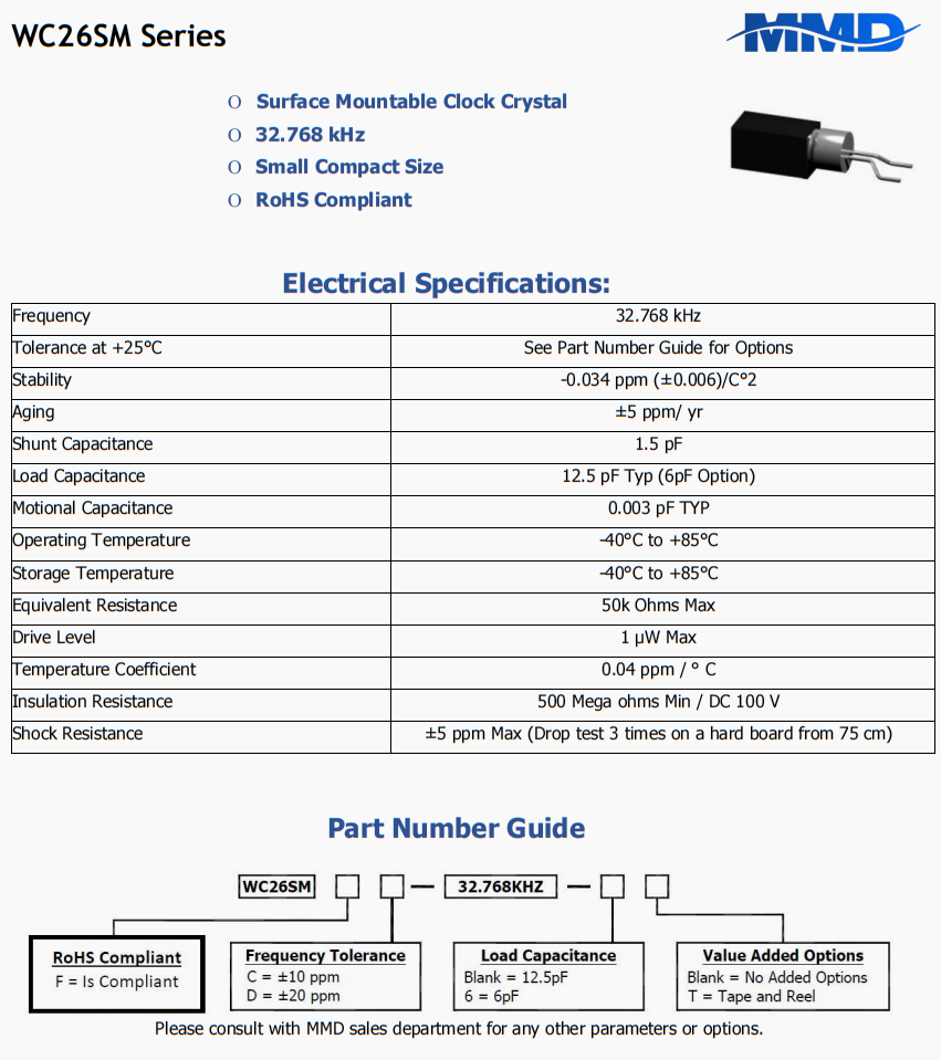 | WC26SMFC-32.768KHZ-T | MMD | WC26SM | -40°C ~ 85°C | 32.768 kHz | ±10ppm | 12.5 pF | |