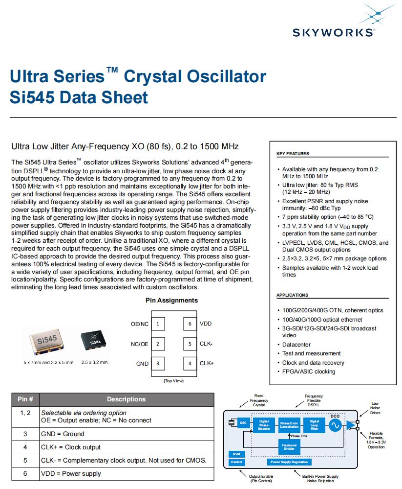 | 545BAA100M000CCG | Skyworks Solutions Inc. | Ultra™ Si545 | 100 MHz | LVDS | 1.8V, 2.5V, 3.3V | ±20ppm |