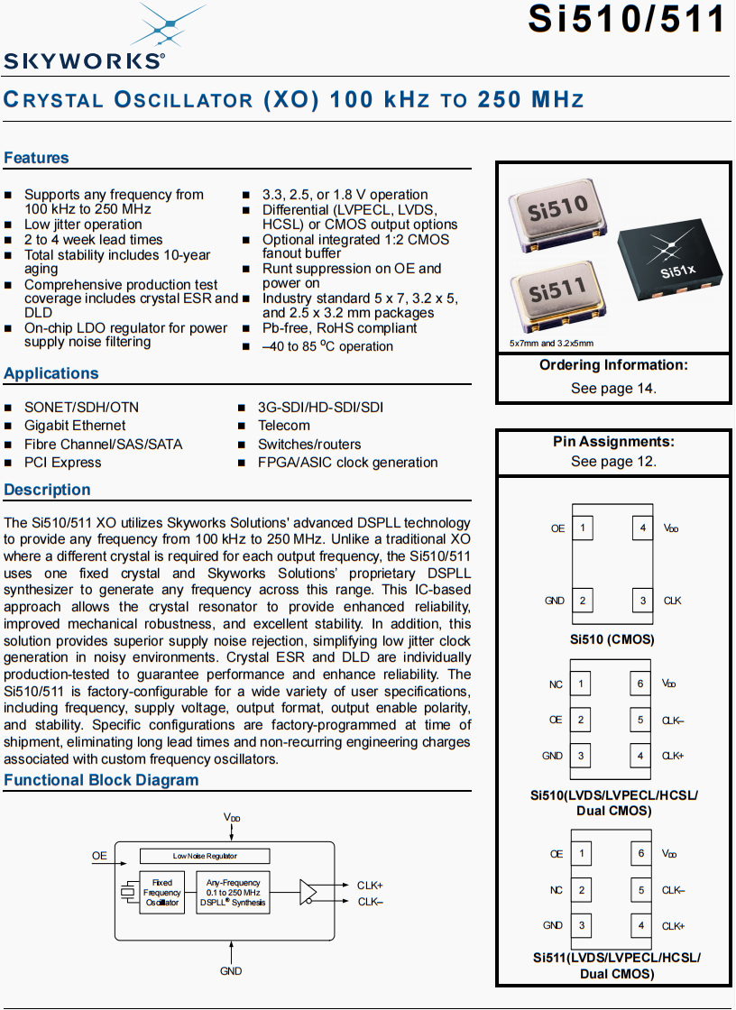 | 510BCA125M000BAG | Skyworks晶振 | Si510 | XO | 125 MHz | LVDS | 3.3V | ±20ppm |