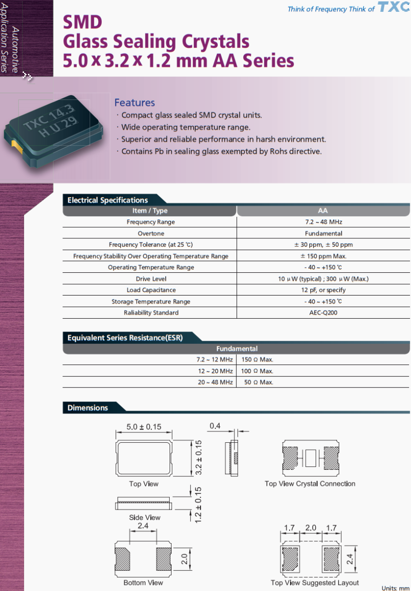 TXC臺(tái)產(chǎn)晶振,AA-14.31818MAGD-T晶振,汽車(chē)空調(diào)系統(tǒng)晶振,AA系列SMD,玻璃密封晶體,5.0 x 3.2 x 1.2 mm ,功能。緊湊的玻璃密封SMD晶體單元。工作溫度范圍廣。在惡劣環(huán)境下性能優(yōu)越可靠。不受Rohs指令限制的密封玻璃含鉛。臺(tái)灣TXC晶振公司,晶技晶振,無(wú)源晶振,5032晶振,AA-8.000MALV-T晶振,汽車(chē)晶振,汽車(chē)電動(dòng)天窗控制系統(tǒng)晶振,臺(tái)灣晶振,貼片晶振,二腳晶振,石英晶振,高品質(zhì)晶振,車(chē)載多媒體晶振,行車(chē)記錄儀晶振,低損耗晶振,耐高溫晶振,耐沖擊晶振