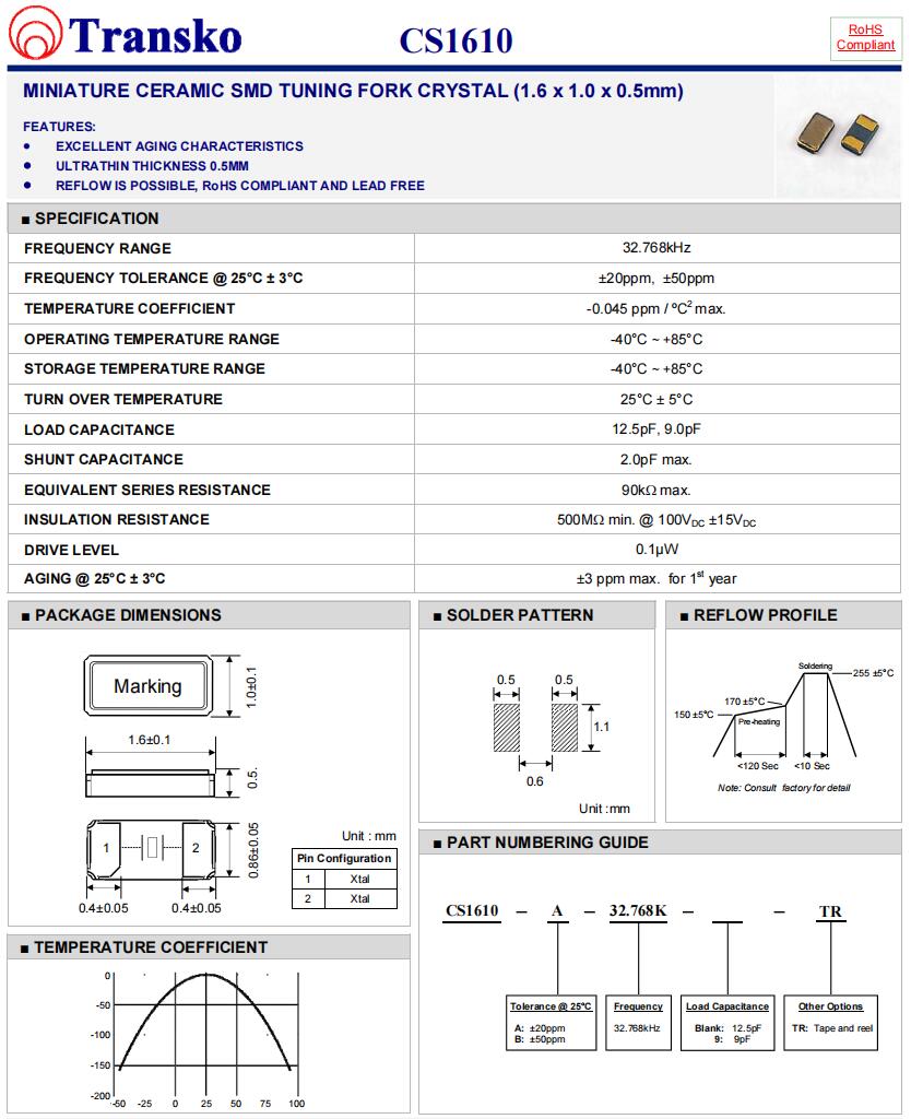 Transko無(wú)源晶振,CS1610-A-32.768K-9-TR,6G無(wú)線模塊晶振參數(shù)表
