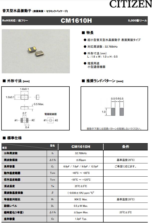 | CM1610H32768DZCT | Citizen Finedevice Co Ltd | CM1610H | kHz Crystal (Tuning Fork) | 32.768kHz |
