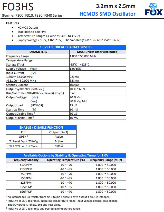 | F316R-50.000 | Fox振蕩器 | F310R | XO (Standard) | 50MHz | 1.8V |