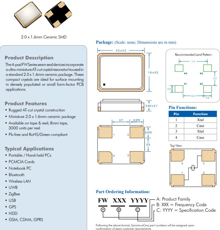 4-pad FW系列接縫密封裝置超微型at切割石英晶體諧振器一個標準的2.0 x 1.6毫米陶瓷封裝。這些致密晶體是表面安裝的理想選擇在人口密集或小形狀因素PCB應用程序。