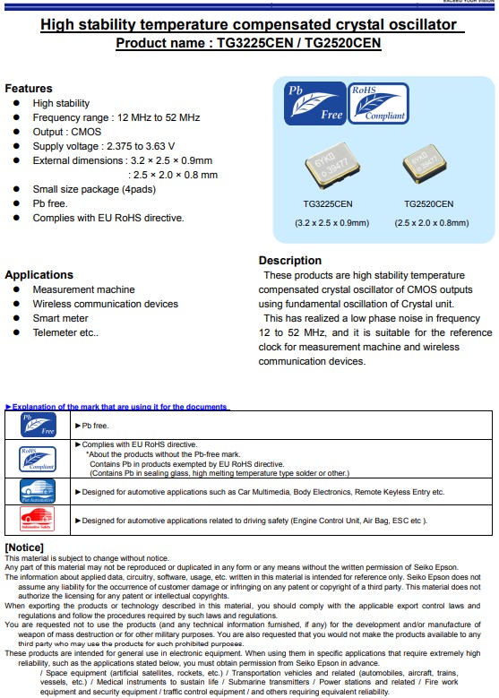 日本愛普生晶振TG2520CEN,是一款TCXO溫補(bǔ)晶振,小體積晶振尺寸2.5x2.0mm有源晶振,四腳貼片晶振,石英晶體振蕩器,電源電壓2.375V至3.63V,具有高穩(wěn)定溫度CMOS輸出的補(bǔ)償晶體振蕩器,超小型,輕薄型,低抖動(dòng),低功耗,低損耗,低耗能,低電源電壓,高穩(wěn)定性等特點(diǎn),利用晶體單元的基本振蕩。這實(shí)現(xiàn)了頻率中的低相位噪聲12MHz至52MHz,適合用作基準(zhǔn)電壓源,無線通信設(shè)備,智能電表,遙測(cè)儀,測(cè)量機(jī)器和無線的時(shí)鐘通訊設(shè)備。