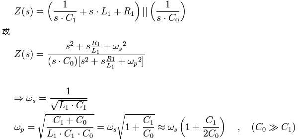 個頻率接近但特性不同的共振點:低阻抗的串聯共振點與高阻抗的并聯共振點。 運用拉普拉斯轉換,該等效電路網絡的阻抗可以寫成以下數學式: