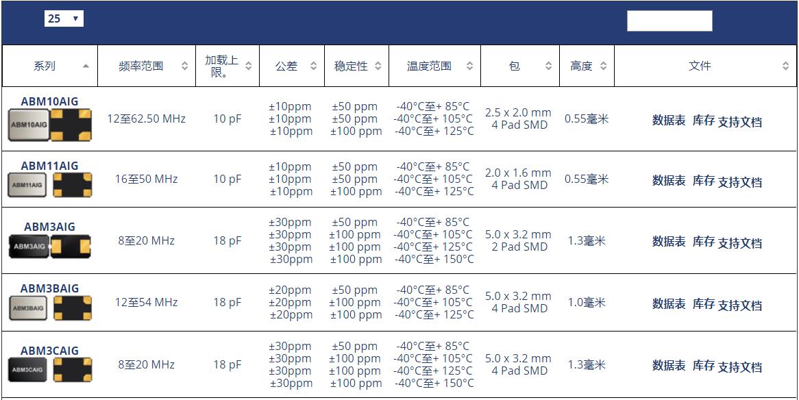 ABM8G晶振系列原廠代碼表: