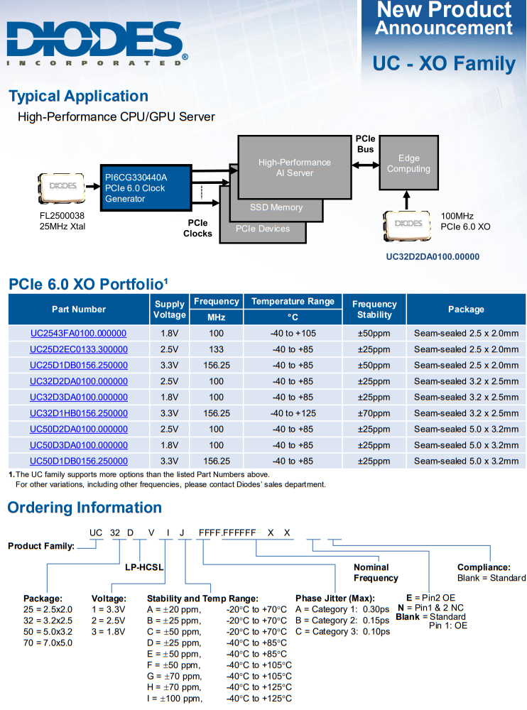 DIODES公司UC型號(hào)石英晶體振蕩器的超低抖動(dòng)使其成為網(wǎng)絡(luò)和計(jì)算應(yīng)用中PCIe 6.0時(shí)鐘的理想選擇。PCIe 6.0標(biāo)準(zhǔn)100MHz頻率,可選25~161MHz頻率范圍,靈活的頻率選擇支持各種系統(tǒng)設(shè)計(jì)要求,低15mA電流,支持1.8V, 2.5V, 3.3V供電電壓,標(biāo)準(zhǔn)HCSL器件的一半供電電流,超低<100fsRMS的抖動(dòng),片上終端無需外接電阻,節(jié)省電路板空間,降低成本。 特征,超低相位抖動(dòng),最大有效值0.1ps。(12kHz至20MHz),溫度范圍擴(kuò)展至125℃,完全無鉛和完全符合RoHS標(biāo)準(zhǔn),無鹵素和銻。“綠色”產(chǎn)品,在單獨(dú)的數(shù)據(jù)表(UCQ系列)下提供符合汽車標(biāo)準(zhǔn)的部件。應(yīng)用程序,網(wǎng)絡(luò)系統(tǒng),光學(xué)模塊,服務(wù)器和存儲(chǔ)系統(tǒng),專業(yè)視頻設(shè)備,測(cè)試與測(cè)量,F(xiàn)PGA/ASIC時(shí)鐘生成,112 g系列應(yīng)用程序。
