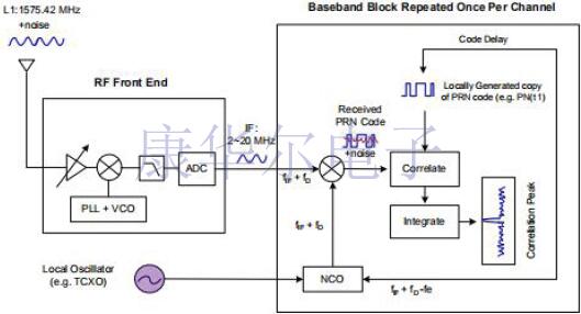 圖2說明了標準的GPS接收器架構[2].在RF前端,它包括放大器,濾波器和A-D轉換器.天線接收GPS信號和衛星產生的噪聲,然后RF前端通過混頻器,濾波器和A-D轉換器將RF信號從RF傳輸到IF(中頻).根據接收機設計,中頻通常在2-20MHz的范圍內.