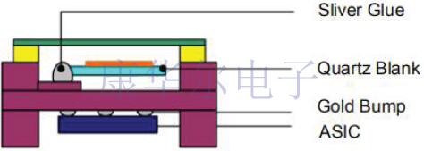圖6說明了具有H型封裝結構的TCXO.封裝的橫截面類似于字母H,在上腔中安裝有密封AT切割石英諧振器,在下腔中安裝有IC芯片.不合格的石英晶體諧振器可以在倒裝芯片組裝之前進行檢查和剔除.